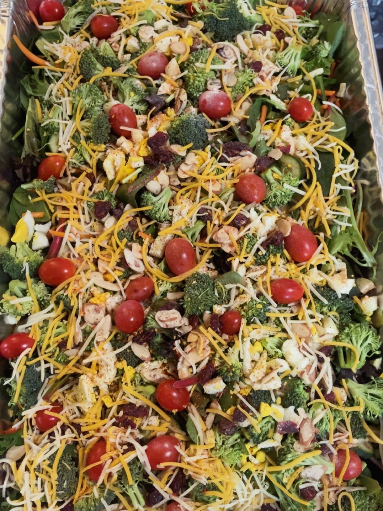 It typically starts with a base of crisp greens like romaine, iceberg, spinach, or spring mix, layered with a variety of garden-fresh vegetables such as: