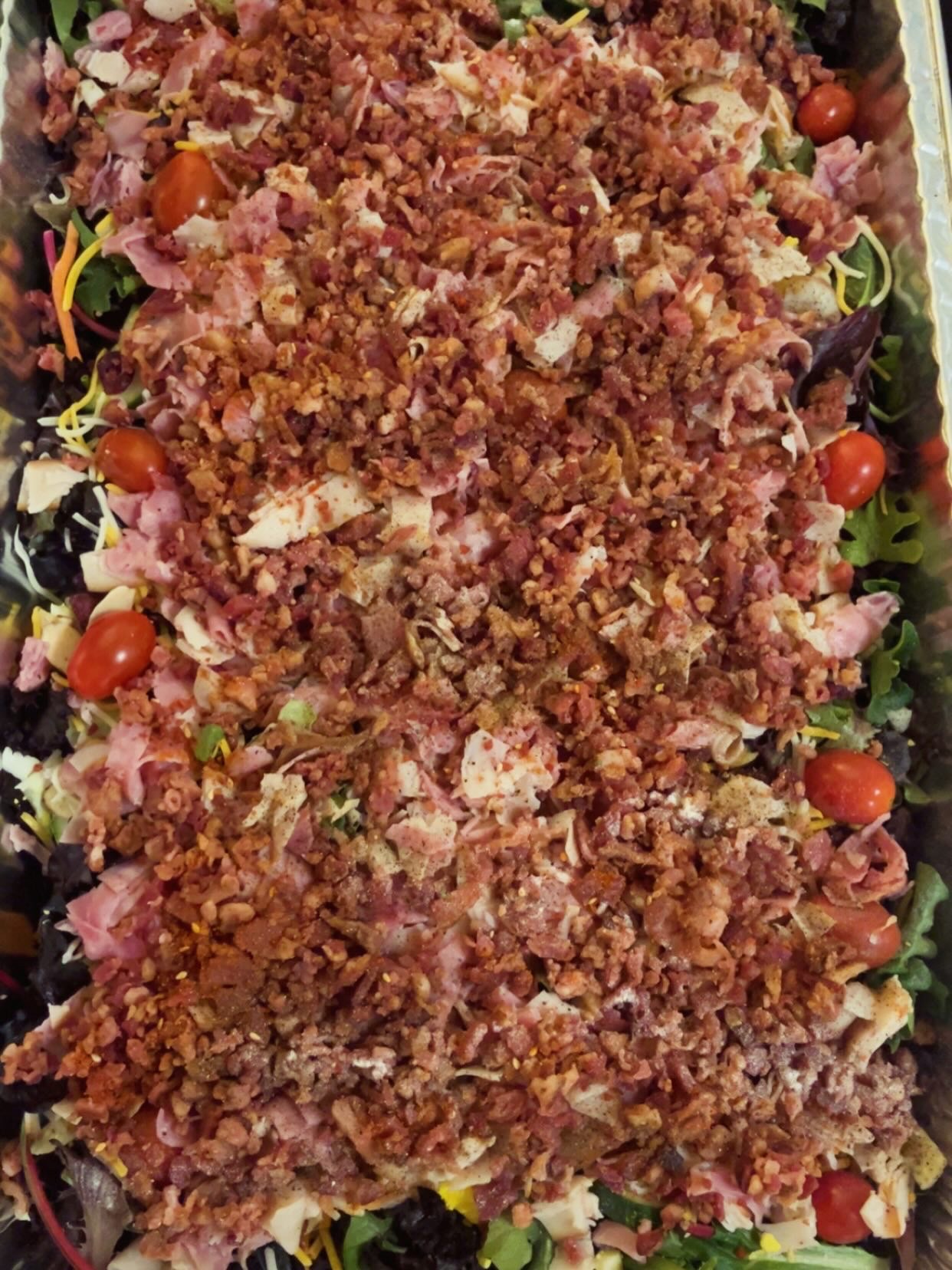 It features a base of crisp romaine or mixed greens, layered with juicy grilled or roasted chicken, ham (or turkey) and generous pieces of crispy, smoky bacon that add a rich, salty crunch.