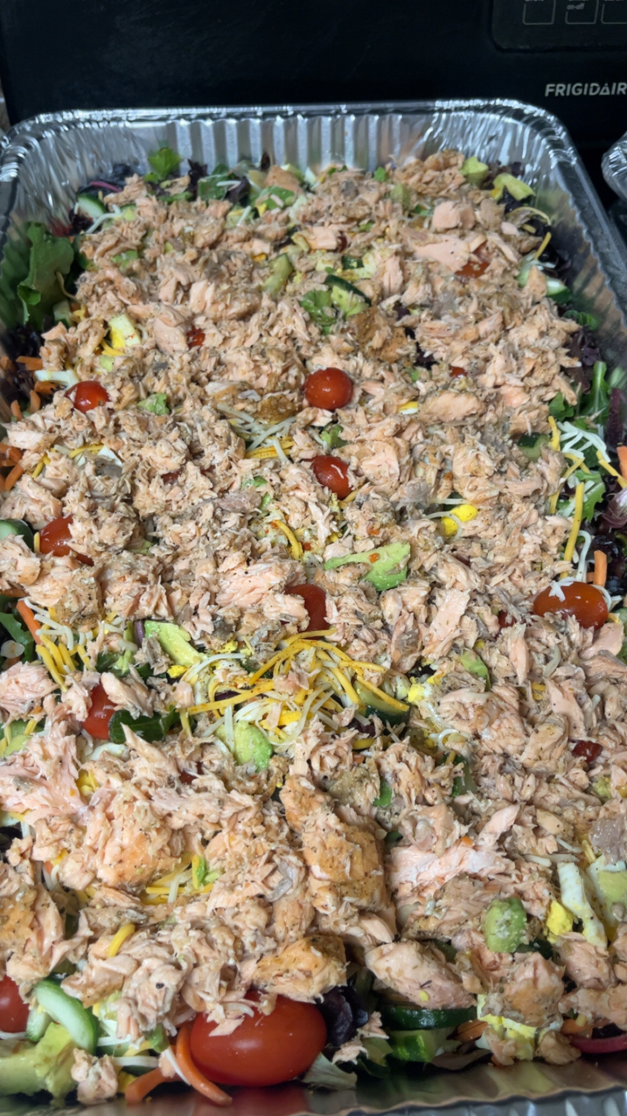 It features flaky, tender salmon—grilled, baked, or pan-seared—seasoned to perfection with herbs, citrus, or light spices. The salmon brings a savory depth and a melt-in-your-mouth texture that pairs beautifully with creamy slices of ripe avocado.