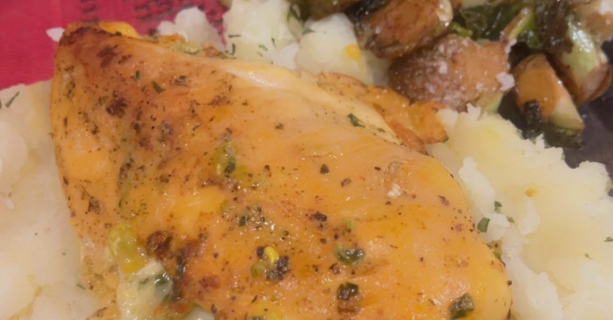 Stuffed Chicken Breast over Mashed Potatoes w/ Spinach, Corn and Glazed Brussel Sprouts