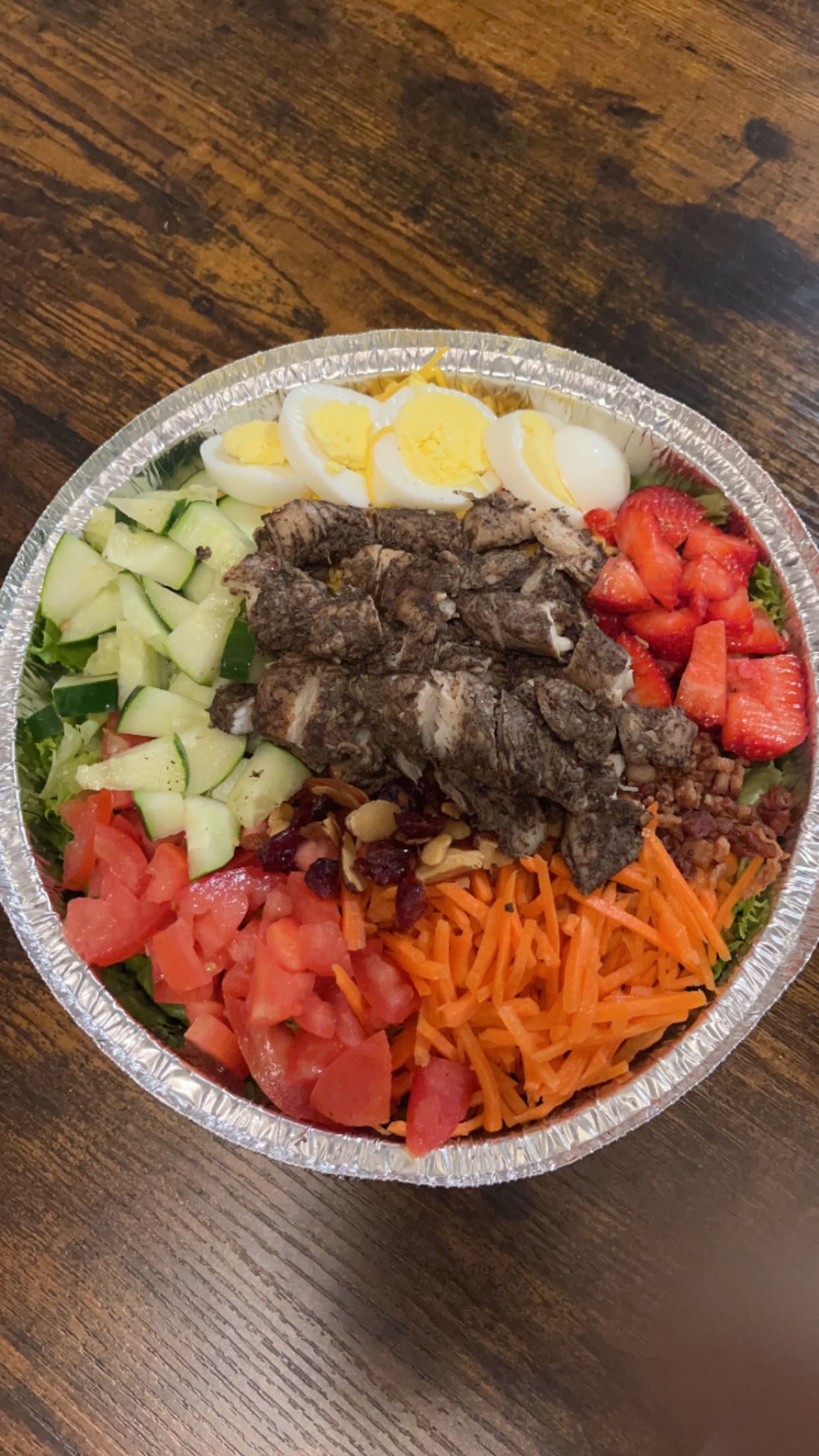 Salads come with Romaine lettuce, tomatoes, cucumbers, shredded cheese, boiled egg, croutons, cranberries/almonds, shredded carrots